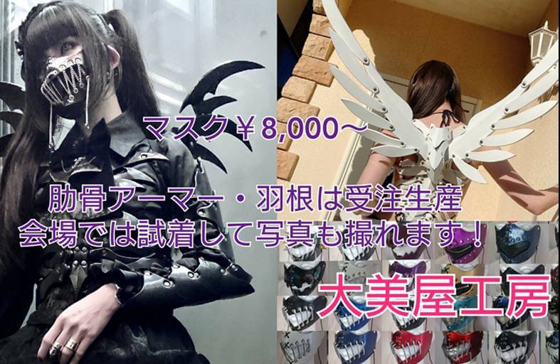 主に出展会場ではマスクを中心に販売します。また、売り子がオリジナルコスチュームを装着しますので、そちらはオーダーにて注文を受けております。